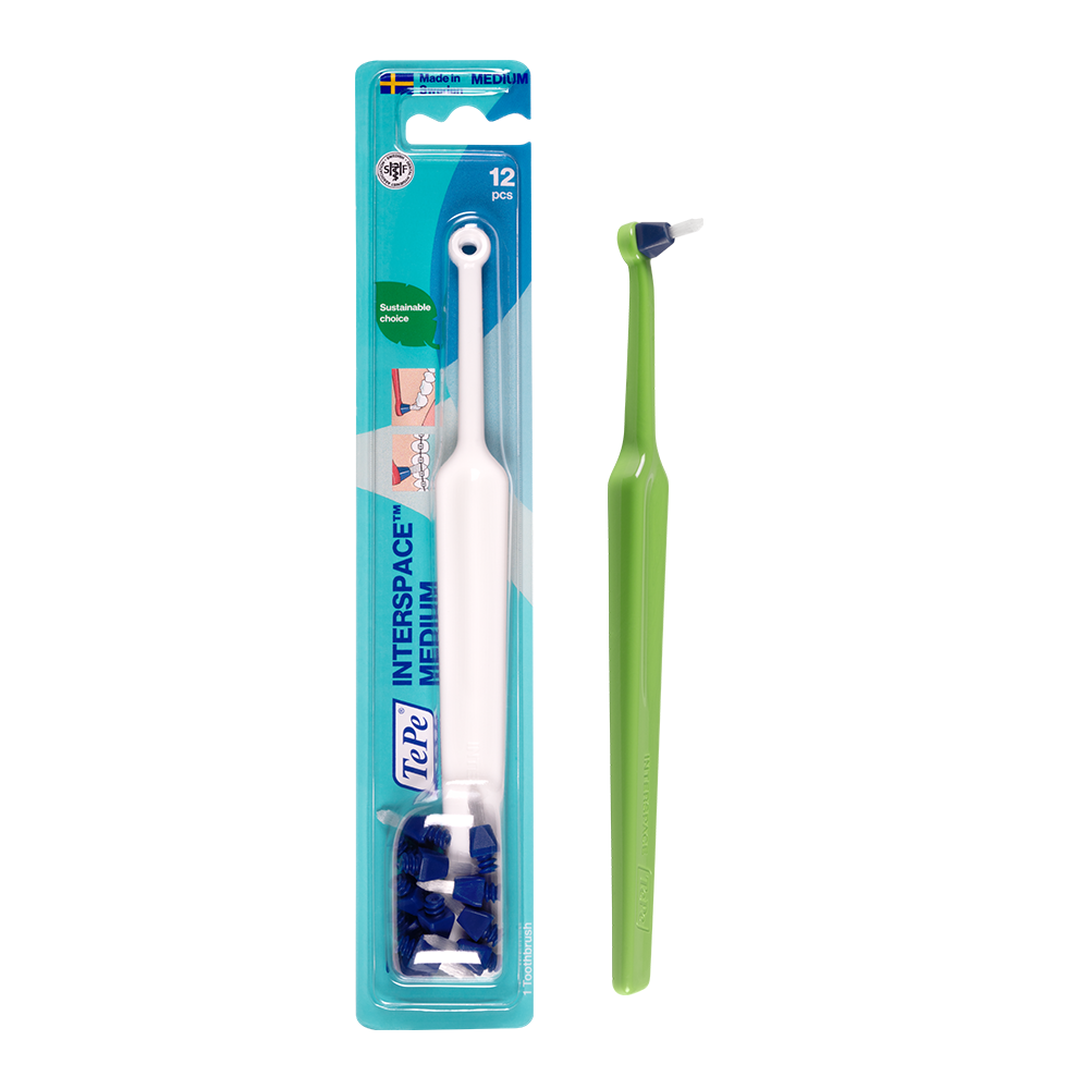 TePe Interspace Medium je četkica s jednim snopom vlakana koja su na izmjenjivim nastavcima. Glava pod kutem i zašiljeni vrh omogućuju bolji pristup teško dostupnim područjima, poput furkacija i stražnjih zubi