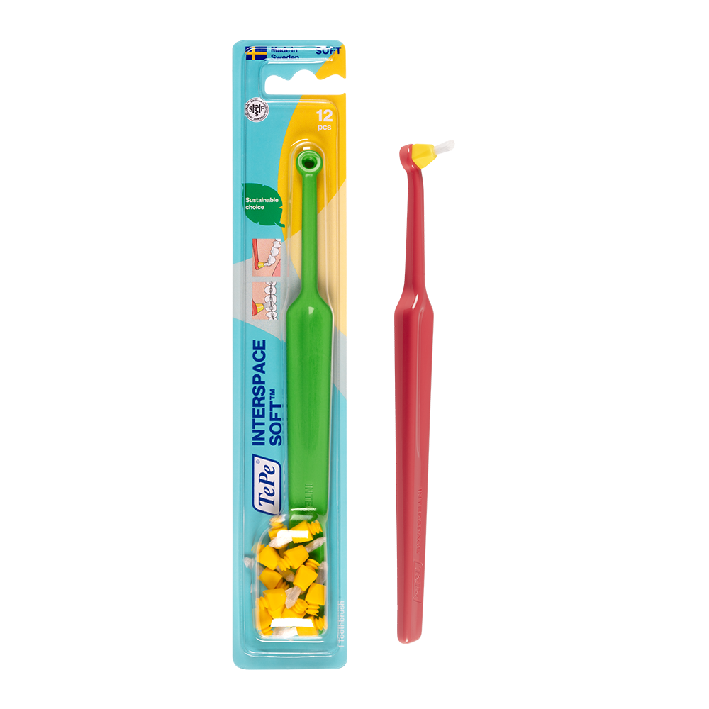 TePe Interspace Soft je četkica s jednim snopom vlakana koja su na izmjenjivim nastavcima. Glava pod kutem i zašiljeni vrh omogućuju bolji pristup teško dostupnim područjima, poput furkacija i stražnjih zubi