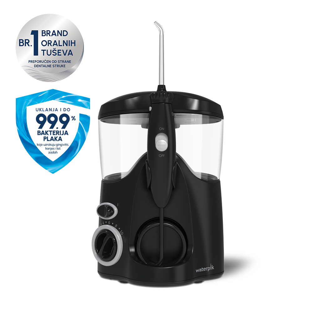 WP-112 Waterpik Ultra Black Satin oralni tuš kompaktnog dizajna i crne satenske boje, idealan i kao estetski dodatak vašem kupatilu. WP-112 Waterpik Ultra Black Satin oralni tuš uklanja bakterije duboko između zuba i ispod linije desni. WP-112 Waterpik Ultra Black Satin oralni tuš posjeduje napredni sustav za kontrolu tlaka s 10 postavki, kontrolnim gumbom na ručki za pauziranje protoka tekućine, te poklopcem spremnika za tekućinu i prostorom za pohranu nastavaka.